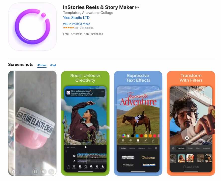 InStories offers a middle ground between template-based editors and more complex editing platforms. This tool specializes in creating cohesive visual stories that maintain your brand identity across multiple Reels. Its strength lies in its extensive library of animated elements, transitions, and text effects that can be easily applied to your footage.