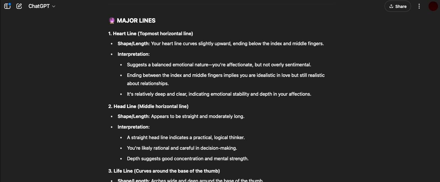Additionally, it taps into the human desire for self-discovery and understanding. Everyone is looking for answers, and palm reading offers a unique perspective on one’s life journey. With ChatGPT, it’s like having a wise friend who’s always available to offer insights—without the judgment! This blend of technology and tradition not only makes palmistry accessible to a broader audience but also encourages a deeper exploration of self-reflection. Users often find themselves contemplating their life choices and future paths as they engage with the AI, leading to meaningful discussions about fate and free will.